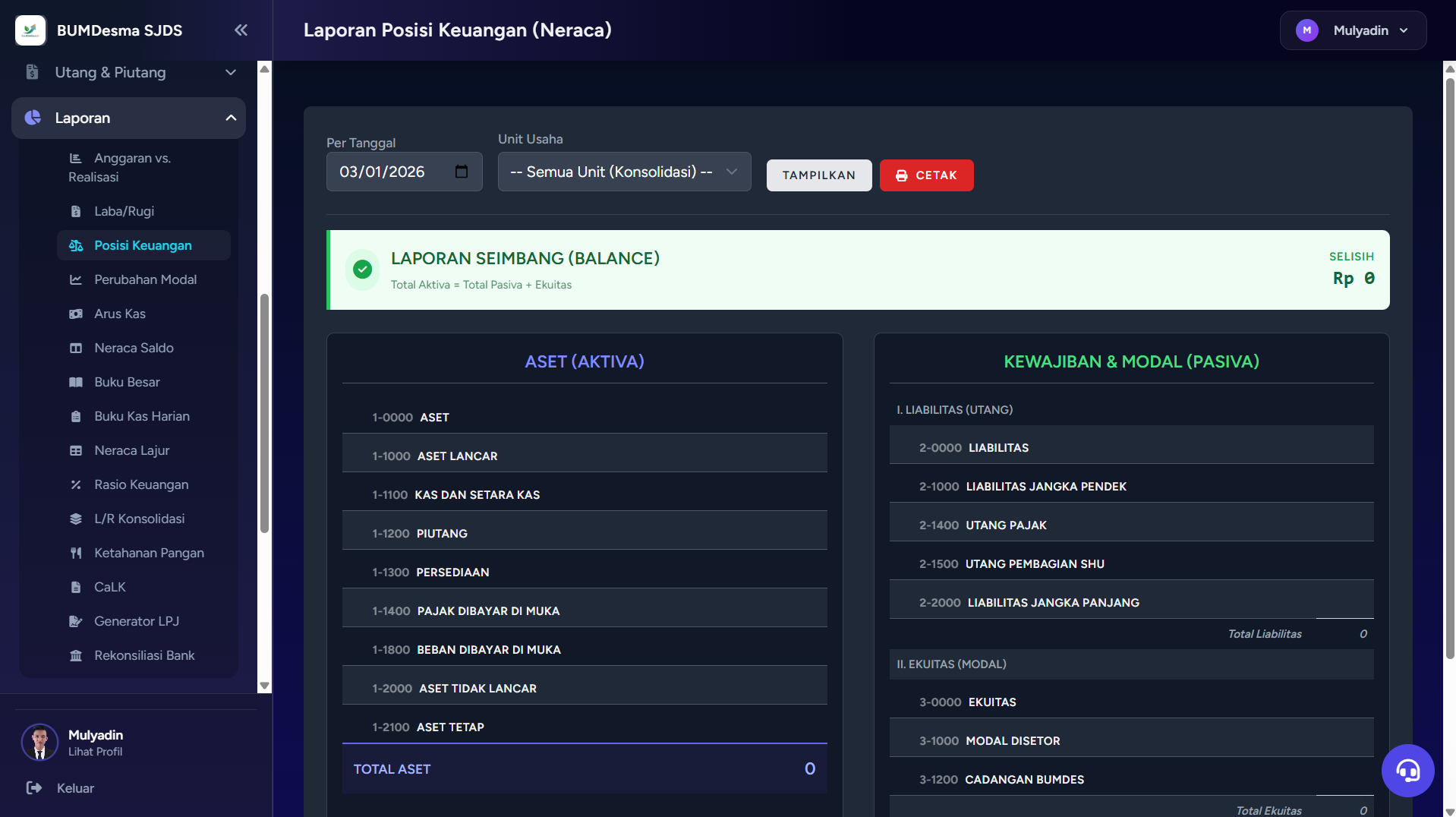 Sik-BUMDesGO memiliki arsitektur Multi-Unit. Pengurus di masing-masing unit cukup mencatat transaksi unitnya sendiri, dan sistem akan secara cerdas mengkonsolidasikan seluruh data tersebut menjadi Satu Laporan Keuangan BUMDes Pusat, lengkap dengan fitur eliminasi akun Rekening Koran (RK) antar unit sesuai standar.